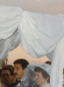 The ceremony was scheduled for 7:00 p.m., enough after sundown to satisfy our Rabbi-for-Rent. Our guests gathered around the chuppah. The sky was a tangle of pink, purple and blue clouds with a few weak rays of sunshine piercing the impending dark (my mother had hung a dozen rosaries on her clothesline all day to keep the predicted rain away). My two oldest nephews, Craig and Marc, handed out programs to the mixed faith crowd of Jews, Catholics, Protestants and one Buddhist. This was to be an event unlike any they had seen before. We had designed the ceremony and written our own vows. “Obey” was not a word that either of us was comfortable with. Aunt Gaye commented after the ceremony that we probably were not legally married because our vows did not have the required language.